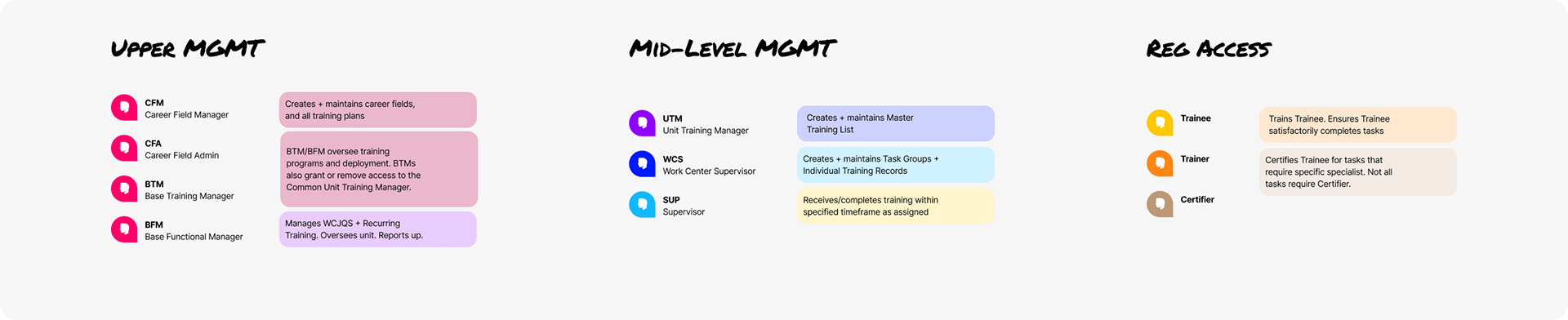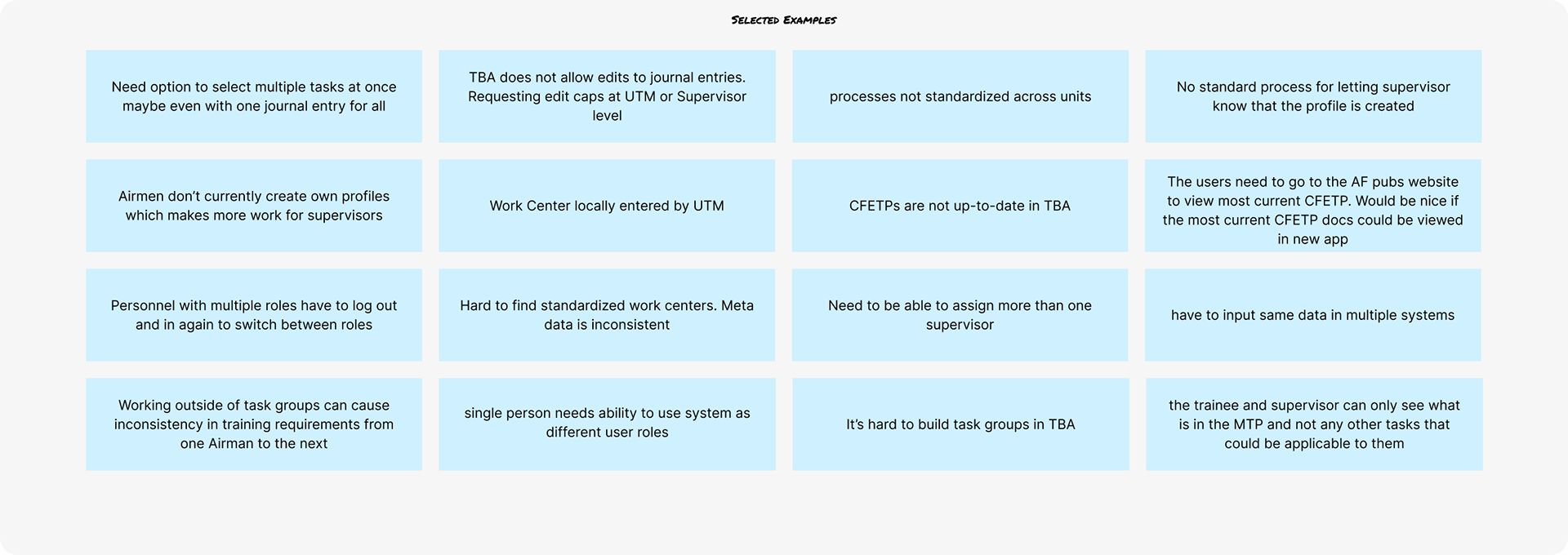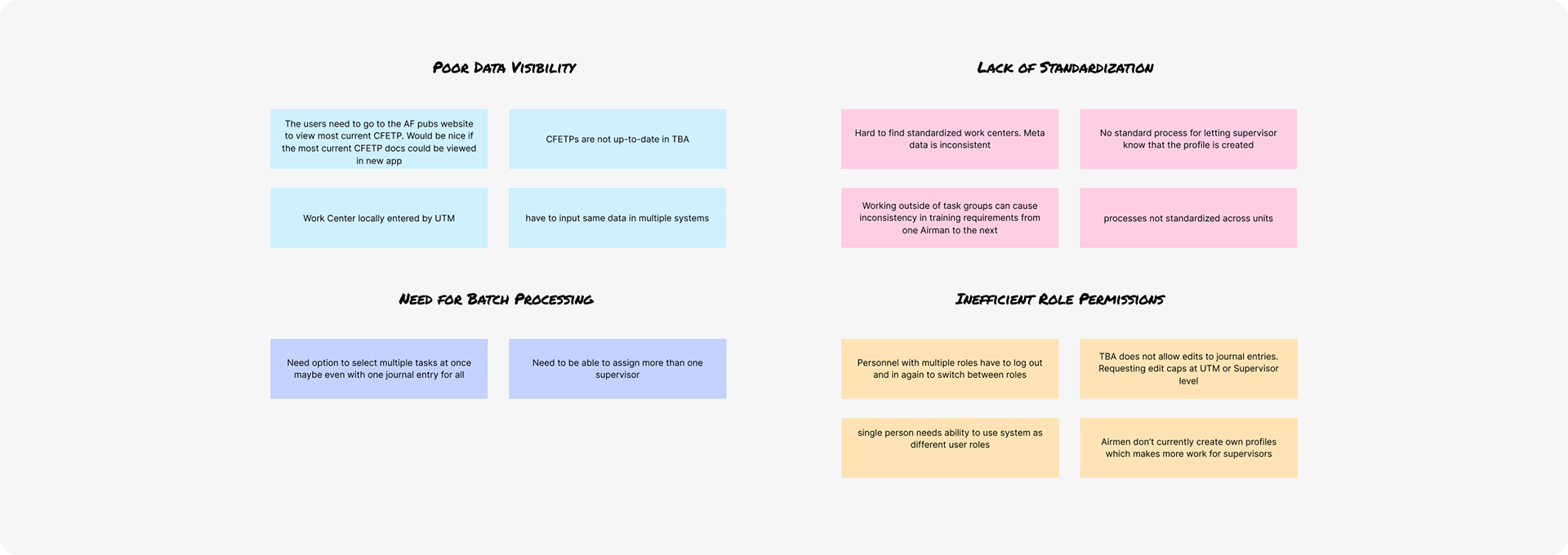 Conducted stakeholder and SME interviews with Training Managers and Airmen to uncover needs, goals, and workflow challenges.
