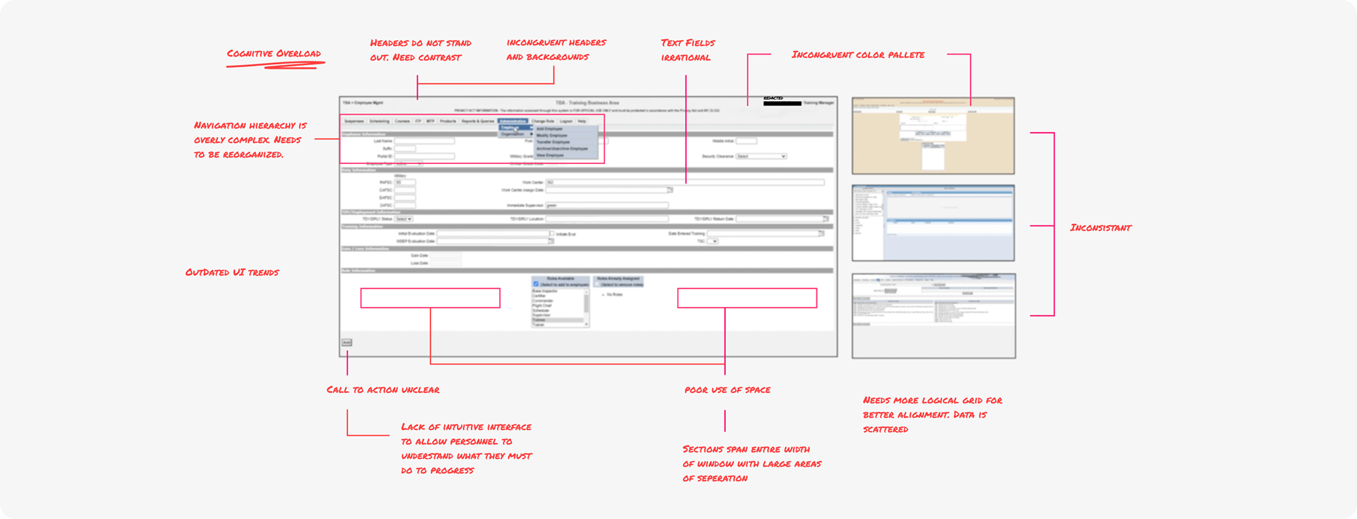 The interface lacked hierarchy, visual clarity, and standard processes, contributing to user frustration and reduced engagement.