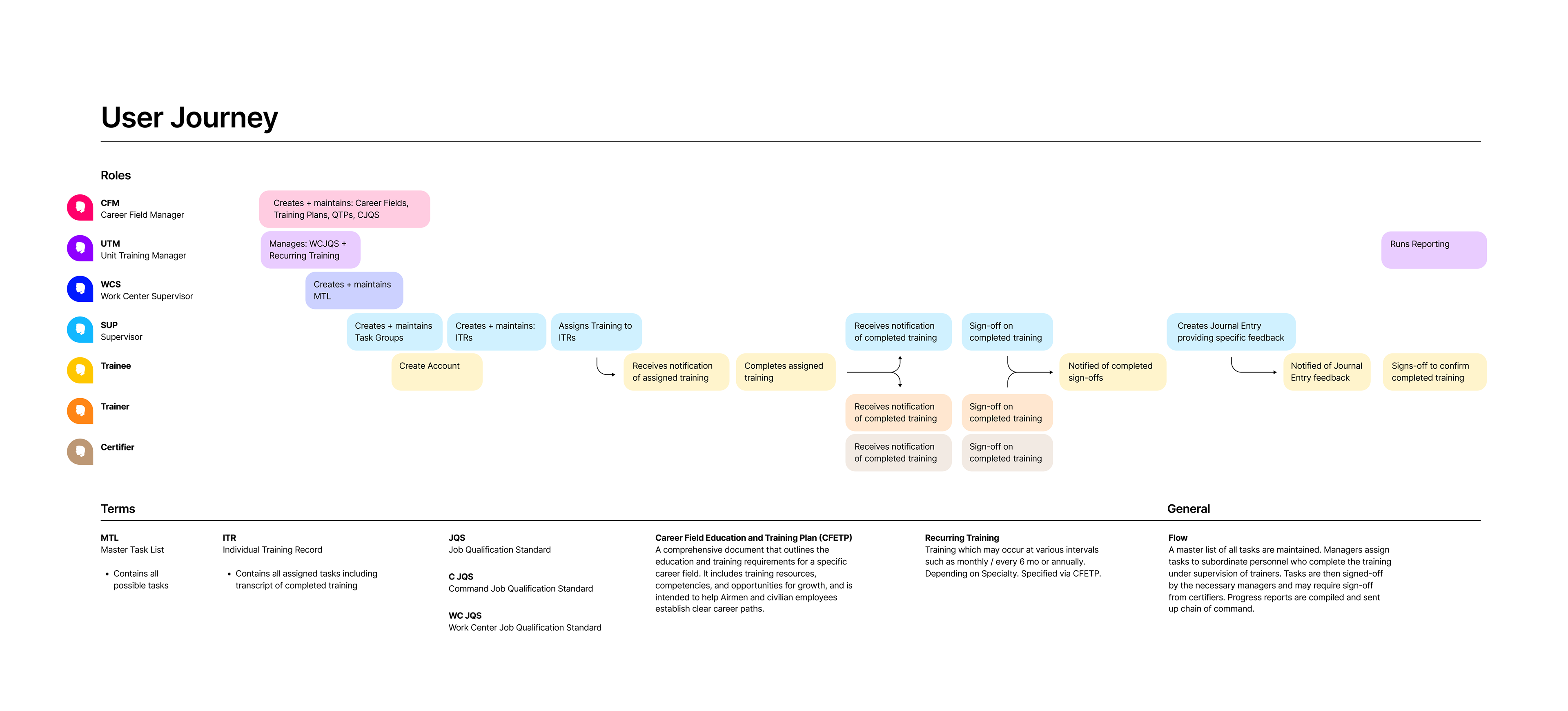 I created a journey map to show the correlation and sequencing among roles and events. Complete with synopsis of the high-level flow: