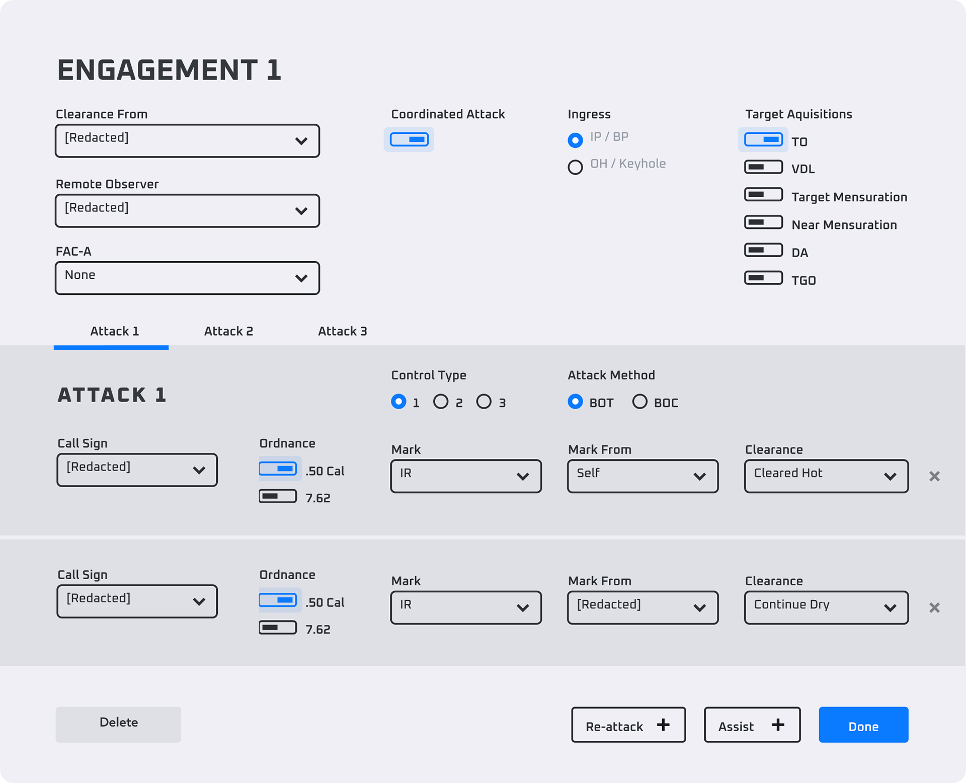 The card is broken down into two main sections. First, an engagement is defined. Secondly, each engagement may have one or more attacks. Additional re-attacks or assists may be selected from the bottom of the card. The UX is setup to handle as many re-attacks/assists as necessary. Navigating the legacy application of this same experience is cumbersome as there are many nested windows within each-other which can get chaotic fast.
