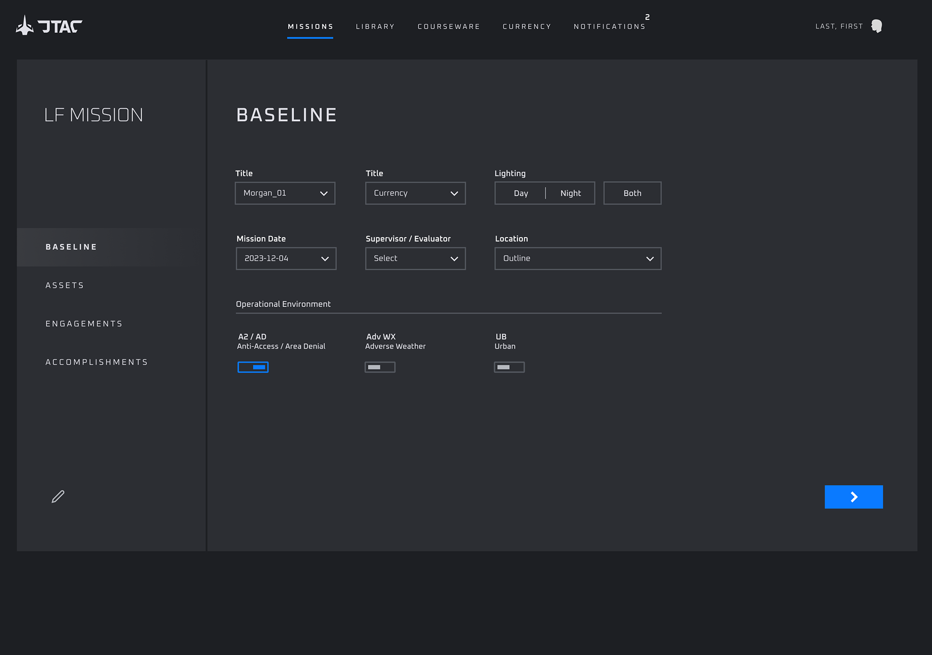 Engagements are selected the same way the user has selected and airframe. Between drop-downs, toggles, radio buttons, and another navigation within the overlay–there is certainly plenty of information. Initially when designing this overlay specifically, I had to keep re-working the layout to accommodate all the data while also keeping everything fairly compact.